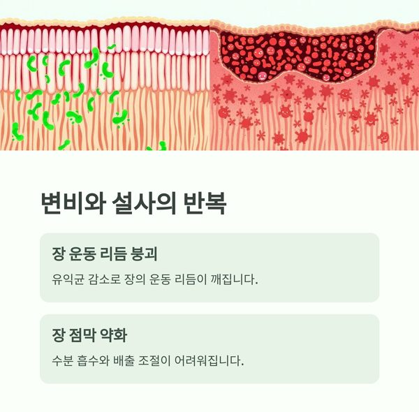 장 점막이 약해져 변비와 설사가 번갈아 발생할 수 있습니다.