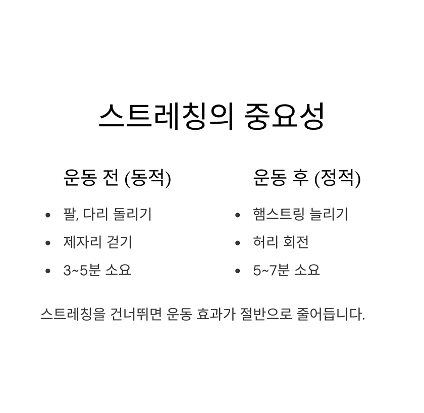 운동 후에는 정적 스트레칭(근육 이완 중심)을 해주세요.