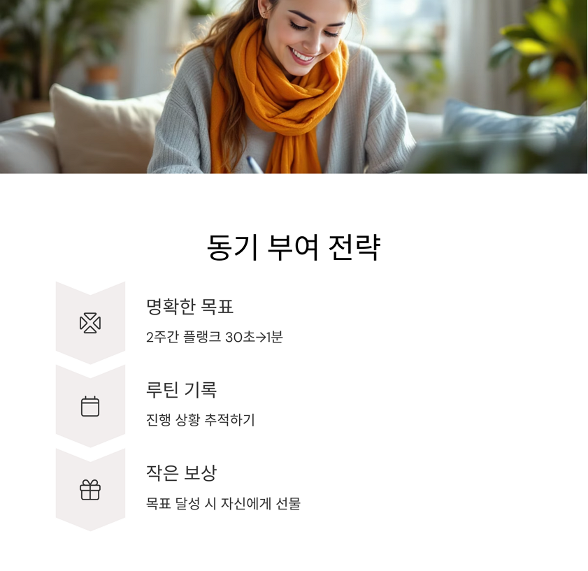 예: "2주간 플랭크 30초 → 1분으로 늘리기" 같은 목표를 설정하고,