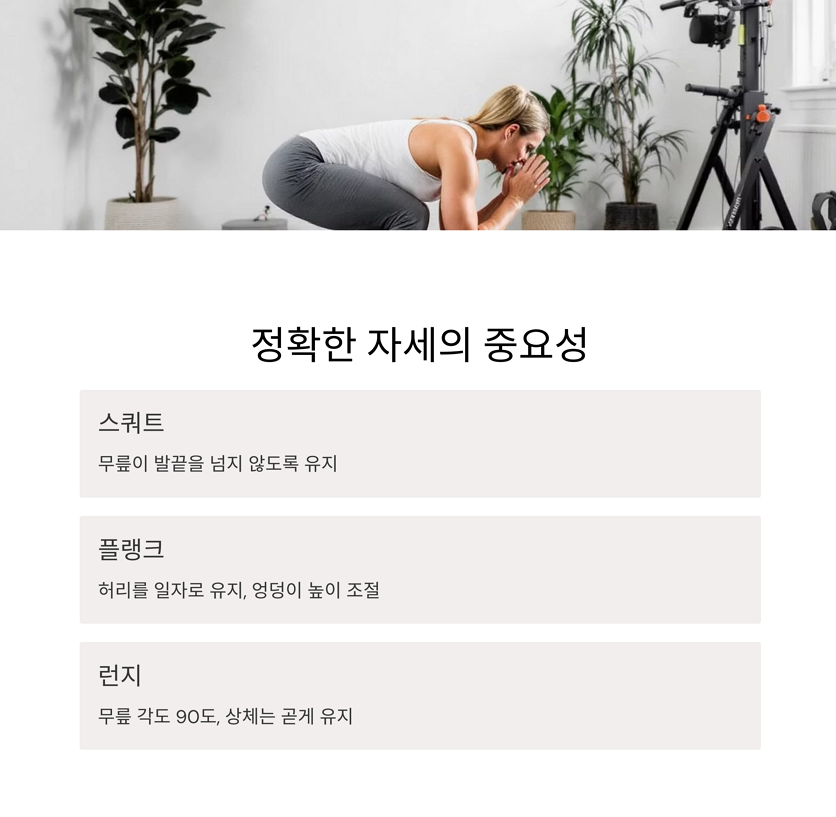 예를 들어 스쿼트를 할 때 무릎이 발끝을 넘지 않도록 유지해야 하며,