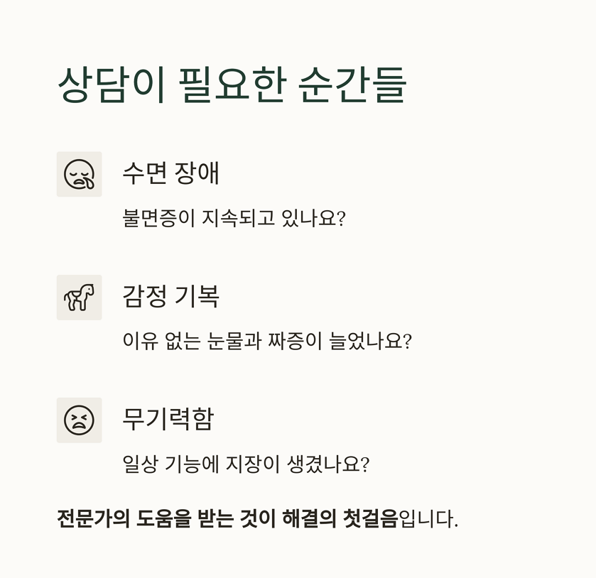 아래와 같은 상태가 지속된다면, 심리 상담을 고려해야 할 시점입니다.